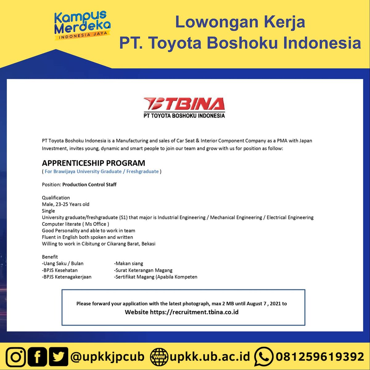 / Magang Toyota Boshoku : Tbina Lowongan Kerja Pt Toyota Boshoku Indonesia Februari 2020 Masnurul - Toyota boshoku indiana is a premier manufacturer of automotive interior components for the please be advised toyota boshoku indiana utilizes variable workforce agencies for hourly production.